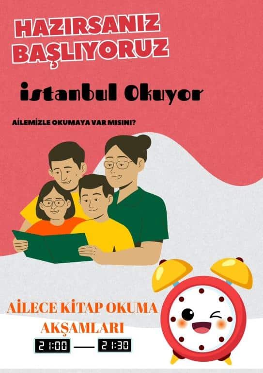 “İstanbul Okuyor” Projesi kapsamında öğrencilerimiz ve velilerimizle her akşam 21.00–21.30 saatleri arasında "Ailece Kitap Okuma Saati" gerçekleştiriyoruz.